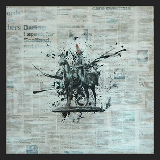 Description: This work was created by hand from Scottish newspapers. There is a slightly glossy look to certain parts of the work depending on the light. Artwork continues around the edges of the canvas.